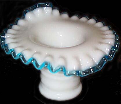 Fenton's prolific milk glass lines in the '50s and '60s helped them survive to be one of the few American art glass firms left today. Their Crest series featured milk glass with applied ruffled edges of clear crystal in the more common Silver Crest line, or the scarcer edge colors of Emerald Crest, Peach Crest, Aqua Crest, Amber Crest, and Ivory Crest. Hobnail, their oldest, most popular pattern, also came in milk glass serving pieces, baskets, and even epergnes.
