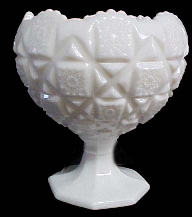 Victorians first used milk glass in the 1840s as an inexpensive alternative to porcelain tableware (though its appearance now seems more quaint than luxurious). Many early American glass firms pressed dishes in milk glass, including such famous patterns as Block-and-Fan, Button and Arches, and Sawtooth. Scarcities include items in Holly, Stars and Stripes, and Ribbed Grape.