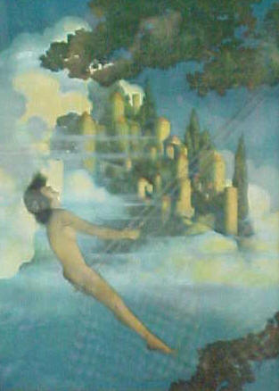 At the beinning of his career in 1903, Parrish won first prize in a contest for prominent illustratriors, sponsored by Ladies Home Journal (Jessie Wilcox Smith and Harrison Fisher also won prizes). Besides winning $1000, his painting, “Air Castles,” was printed in full color in the September 1904 issue. Art prins of “Air Castles” were offered to readers for 10 cents.
