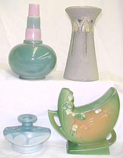 Pottery Company active: 1879 to 1967. Top Left: 8 in artist signed vellum rim design vase. c.1914 SOLD. Space 116. 2nd from left: 8.75 bluish/green William Hentschel vase. c.1911. $2000.00. Space 191. Top Right: Flared rim matt pink vase. c.1923. SOLD. Space 28. 2nd from Right: High-glaze brown vase. c.1953. $225.00. Space 2. Bottom Left: 3 in creamer and 2 in sugar. c.1928. $150.00. Space 14. Bottom Right: 2 piece dark blue flower frog. c.1922. $400.00. Space 191. Brayton-Laguna