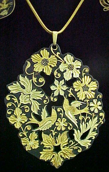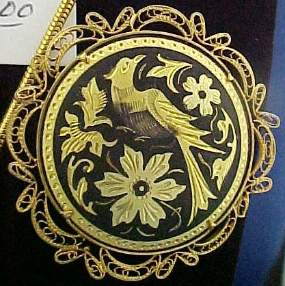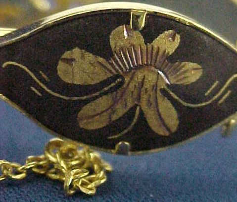 Damascened-inlay jewelry, especially of Japanese origin, is sometimes referred to as shakudo from the use of that alloy as the dark background.