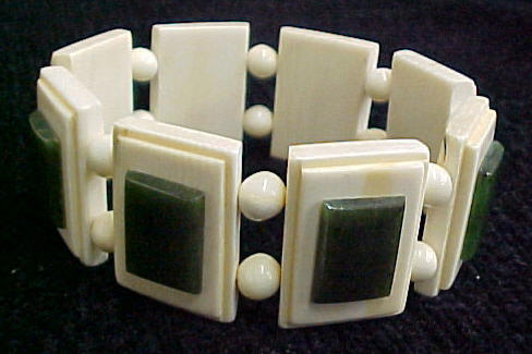Vintage Walrus Ivory with jade panels and beaded elastic bracelet $165 |